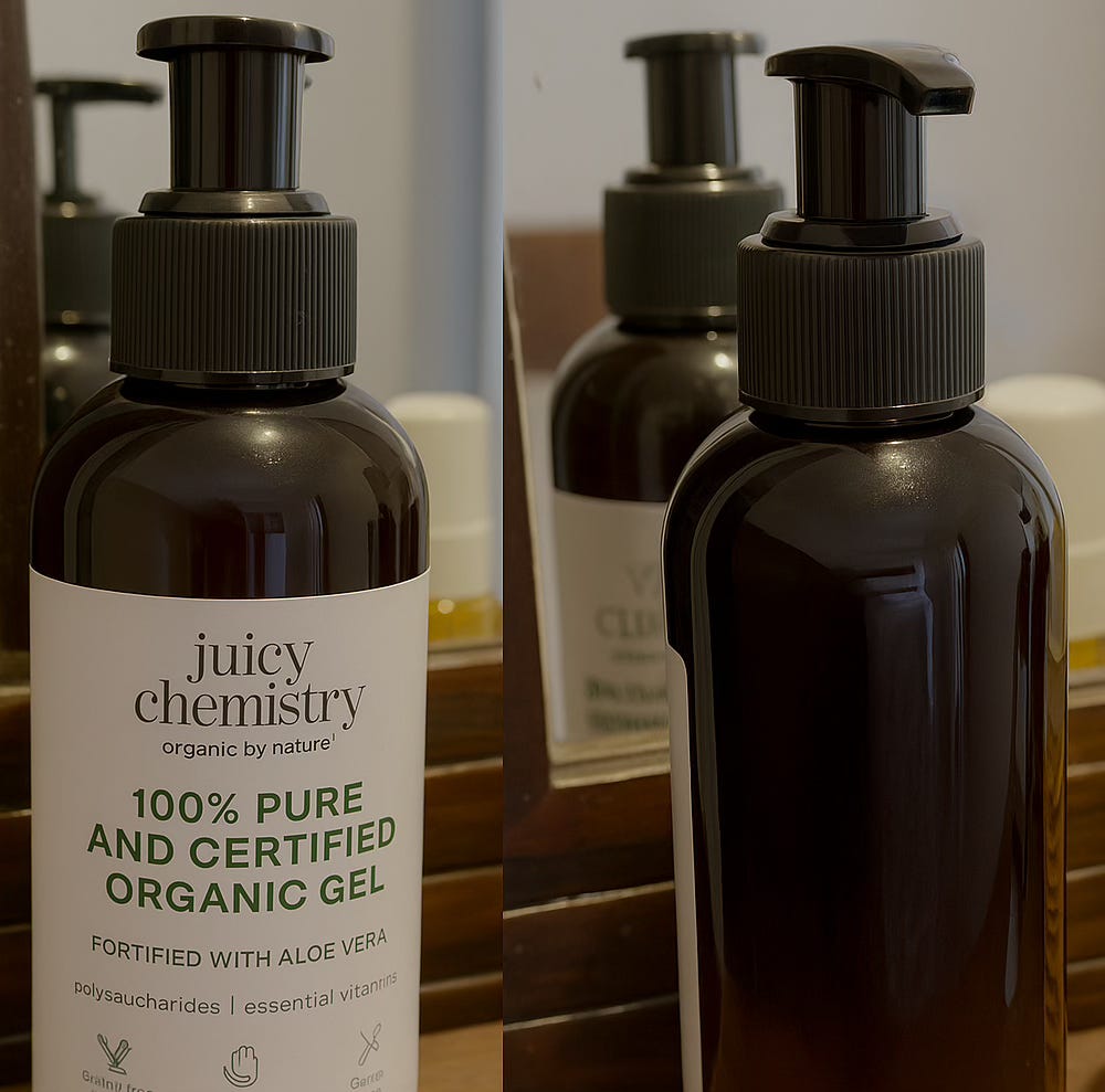 The Juicy Chemistry organic gel bottle exemplifies a critical oversight: the label points away from the user when the dispenser is used. During the moment of maximum engagement with the product, the brand name and value proposition become invisible.