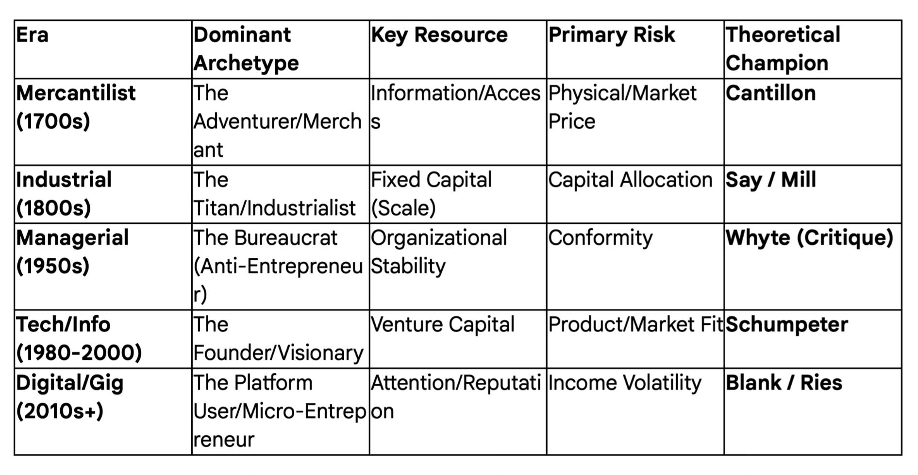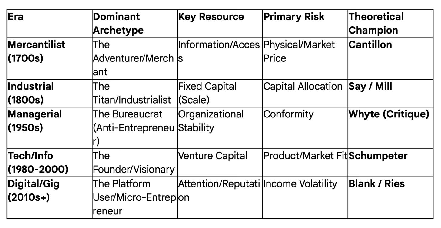 Theory: We have evolved from Cantillon’s “Risk Bearer” to Say’s “Manager,” to Schumpeter’s “Disruptor,” and finally to the modern “Hypothesis Tester” of the Lean Startup.
