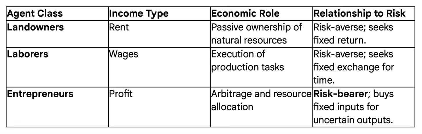 The Entrepreneurs: Those who operate without fixed, secure earnings. Their income is residual and contingent on the success of their judgment.2